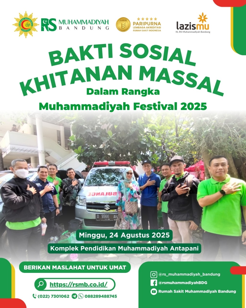 Hari Minggu tanggal 24 Agustus 2025 RS Muhammadiyah Bandung menyelenggarakan kegiatan bakti sosial berupa khitanan masal dilingkungan pendidikan Muhammadiyah Antapani Bandung. Kegiatan ini merupakan salahsatukegiatan Festival Muhammadiyah yang diselenggarakan mulai dari hari Jumat tanggal 22 Agustus 2025. Dalam kegiatan khitanan masal ini diikuti oleh 25 anak warga kota bandung dan sekitarnya.