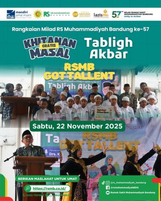 Sabtu, 22 November 2025, RS Muhammadiyah Bandung menyelenggarakan kegiatan bhakti sosial khitanan masal di gedung Auditorium RS Muhammadiyah Bandung. Kegiatan khitanan masal ini merupakan salah satu rangkaian dalam rangka memperingati Milad RS Muhammadiyah Bandung yang ke -57 pada tanggal 18 November. Kegiatan ini terselenggara dengan kerjasama dari Lembaga Zakat Bank Mandiri yaitu Mandiri Amal Insani Jawa Barat dan RS Muhammadiyah Bandung. Kegiatan khitana masal dikuti oleh 60 anak yang merupakan warga masyarakat Kota Bandung dan sekitarnya yang dihadiri dan dibuka langsung oleh dr. Rochimiah,MARS sebagai direktur utama RS Muhammadiyah Bandung.
